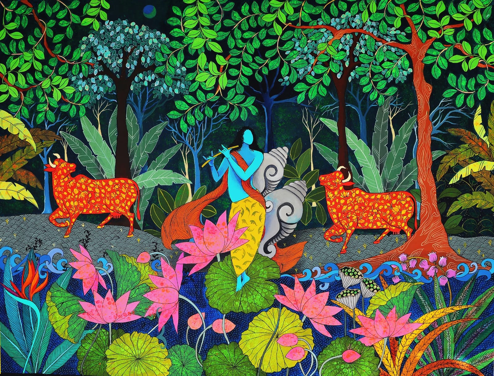 Art to Vohra is true, only when it successfully interacts with its observer. Her visually vibrant depictions of the mundane as well as the surreal, brings about the effect of inculcating an aesthetic pleasure in the viewer while intellectually stimulating them to interpret her vision. Indebtedness towards her rural roots, percolates down to the very basics of her paintings which ultimately allows her to contemplate on the natural elements. She predominantly depicts visions of Lord Krishna.